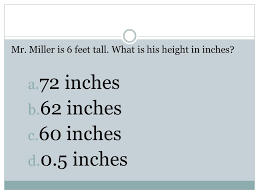 M5 Converting Measures Customary Metric Inches In Feet Ft Yards Yd Miles Mi Millimeters Mm Centimeters Cm Meters M Kilometers Km Length Ppt Download from images.slideplayer.com To convert feet to cm, multiply by 30.48, that makes 5'9 is 175.26 cm. Convert 72 cm to inches. The feet and inches to cm conversion calculator is used to convert feet and inches to centimeters. 180 cm to feet and inches will convert 180 centimeter to feet and inches as well as other units such as miles, kilometers, yards, and meters. The converter will also show you the formula you need to convert between units. Convert a height to feet, inches, or centimeters using a simple calculator. 72 inches equals 182.9 centimeters because 72 times 2.54 (the conversion factor) = 182.9. How many feet it is?